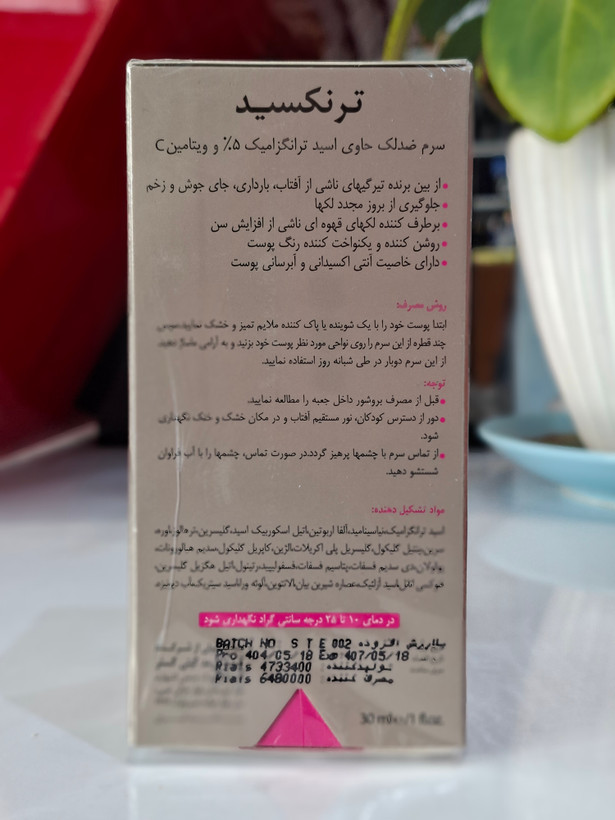 حاوی ترانگزامیک ۵٪ و ویتامین C: از بین برنده قوی تیرگیهای آفتاب، بارداری، جای جوش و زخم